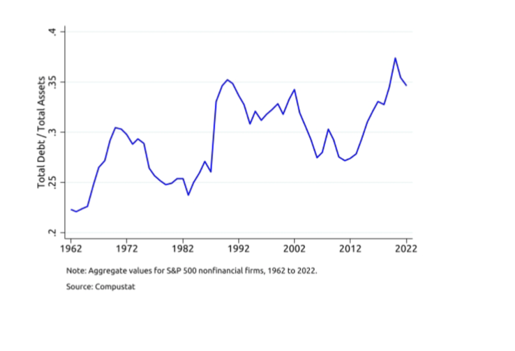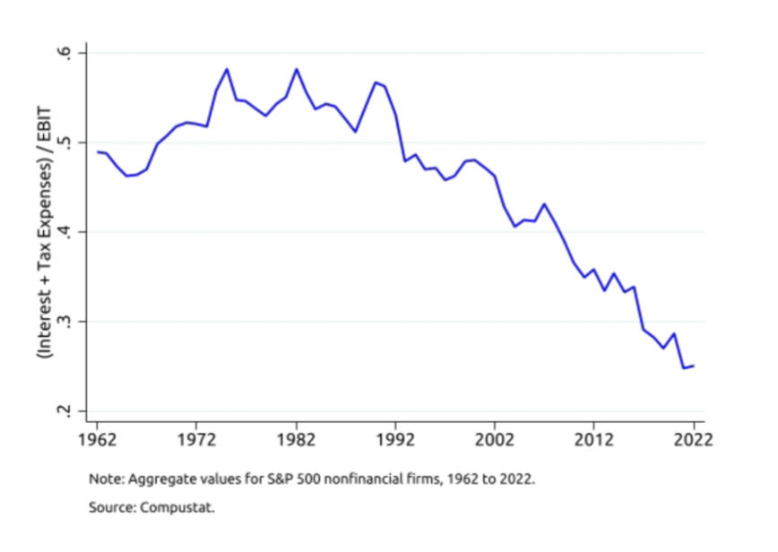 1989 metais IR to aggregate debt sudarė apie 10 proc iš Sp500 non financial sektoriaus įmonių. 2019 metais šis rodiklis pasiekė 3,7 procentus, o 2022 3,2proc. Palūkanų augimas 2022 metais neatsispindi, nes didelės kompanijos 2020-2021 metais užsifiksavo mažas palūkanas, o kai baigsis galiojimas, tada gali tekti refinansuotis daug aukštesnėmis palūkanomis.