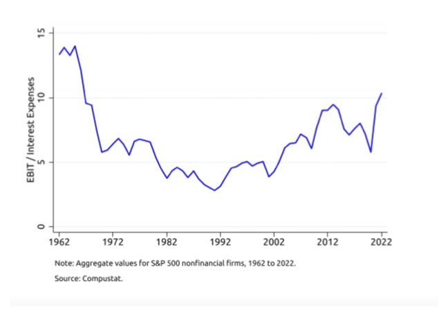 Didelis Corporate Interest rate smukimas leido palūkanų kaštams smukti (smuko kaip dalis nuo EBIT). Kitaip tariant, palūkanų padengimo rodiklis - apibūdinamas kaip EBIT padalintas iš palūkanų kaštų, pagerėjo stipriai. Šiuo metu šis rodiklis stovi labai aukštuose lygiuose lyginant su istorija. Tai rodo, kiek maži yra palūkanų normų kaštai lyginant su EBIT.