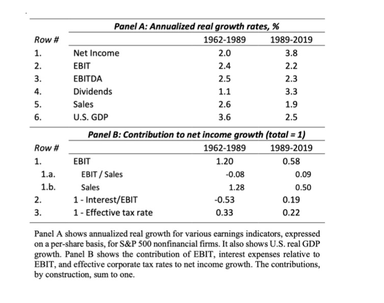 2 eilutė rodo, kad smukimas palūkanų nuo EBIT paaiškina 19 proc. bendro augimo kompanijų pelnuose nuo 1989-2019.