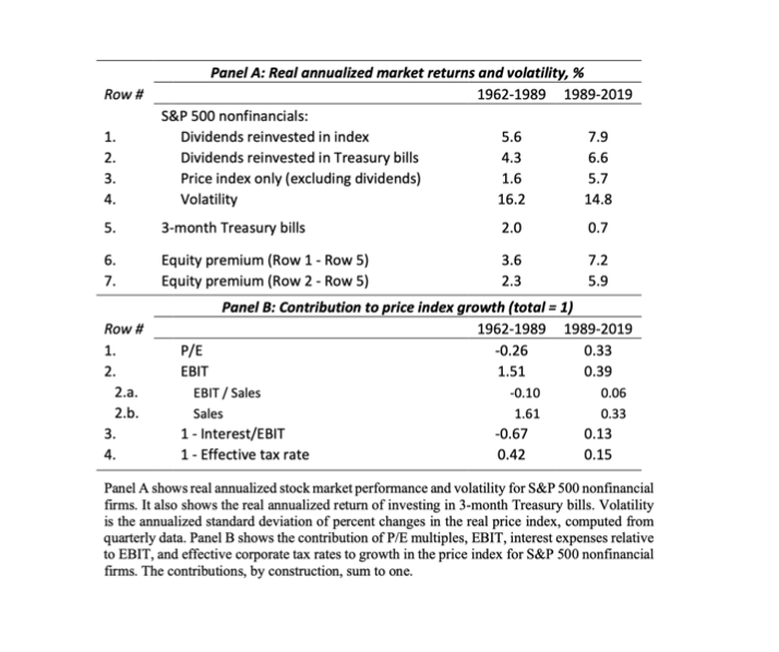 Eilutė 1 rodo akcijų rinkos rezultatus turint omenyje, kad dividendai yyra reinvestuojami atgal į indeksą. 2 eilutė - kai dividendai investuojami į 3 mėn treasury bills. 3 eilutė rodo indekso grąžą ignoruojant dividendus. Visais atvejais, grąža 1989-2019 metais buvo gerokai didesnė nei ta, kuri pasiekta 1962-1989.