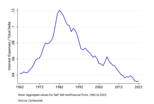 1989 metais IR to aggregate debt sudarė apie 10 proc iš Sp500 non financial sektoriaus įmonių. 2019 metais šis rodiklis pasiekė 3,7 procentus, o 2022 3,2proc. Palūkanų augimas 2022 metais neatsispindi, nes didelės kompanijos 2020-2021 metais užsifiksavo mažas palūkanas, o kai baigsis galiojimas, tada gali tekti refinansuotis daug aukštesnėmis palūkanomis.